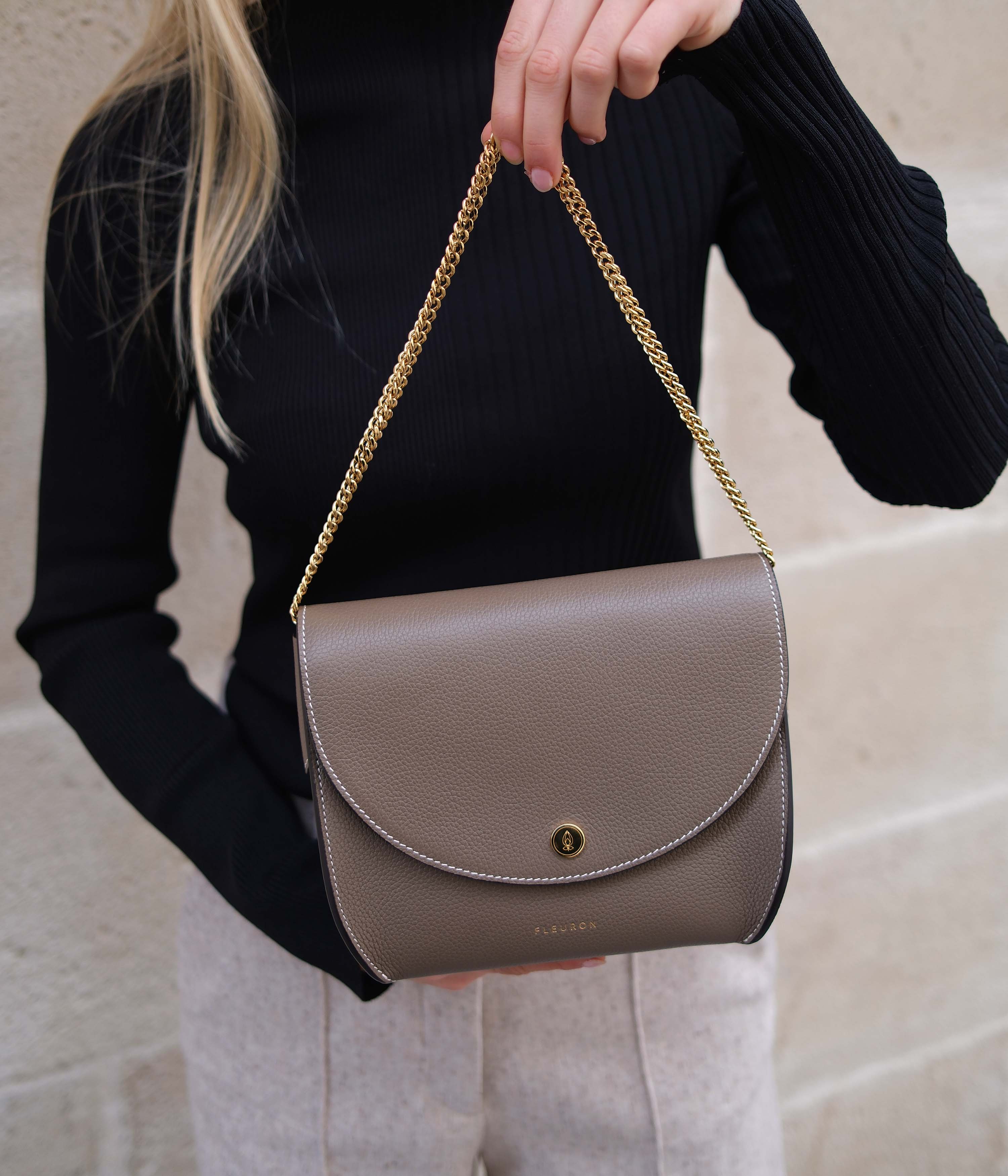 Made from carefully selected grained calf leather, it offers a refined texture and the perfect durability for daily use. Subtle gold-tone accents enhance the sophistication of the Taupe color—a neutral, versatile shade that pairs beautifully with light tones like ecru, sandy beige, or linen for a soft, harmonious look. For a more striking contrast, it also works well with deeper colors such as chocolate brown, navy blue, or olive green, which highlight its natural versatility.