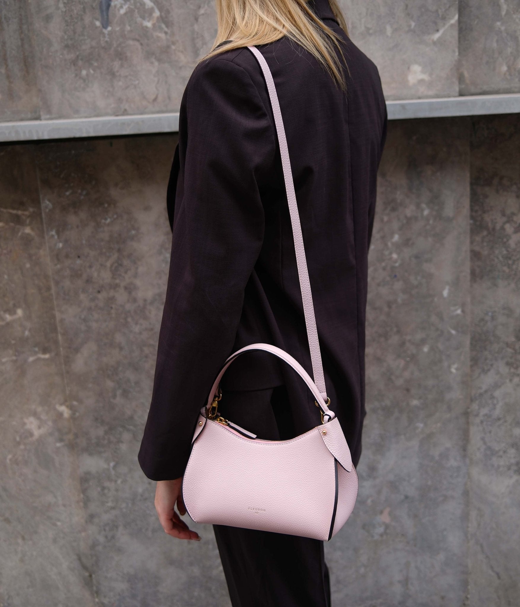 Handcrafted in our Italian workshop, this Mini Pivoine is made from high-quality grained calf leather, tinted in a subtle pink that catches the light with grace. Discreet gold-tone accents add a refined touch of shine.