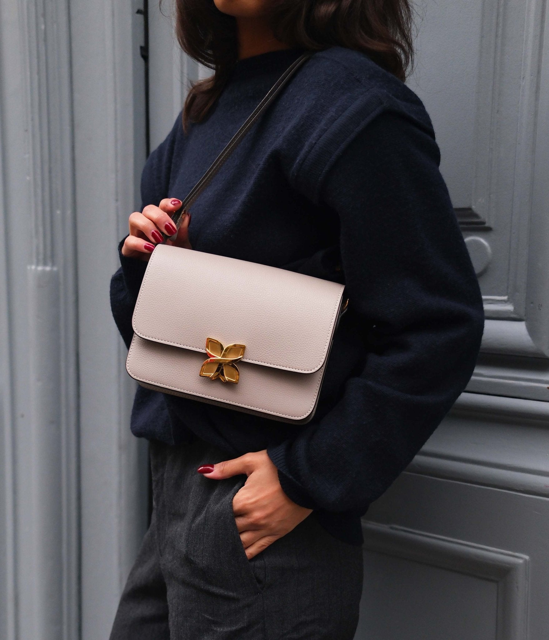 Its signature clasp, inspired by the hydrangea flower, adds a poetic and distinctive touch to this structured design. Inside, the bag offers a spacious and functional interior, thoughtfully designed to hold all your daily essentials with ease.